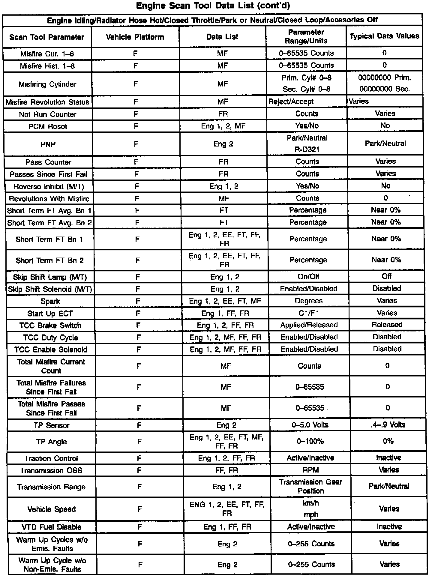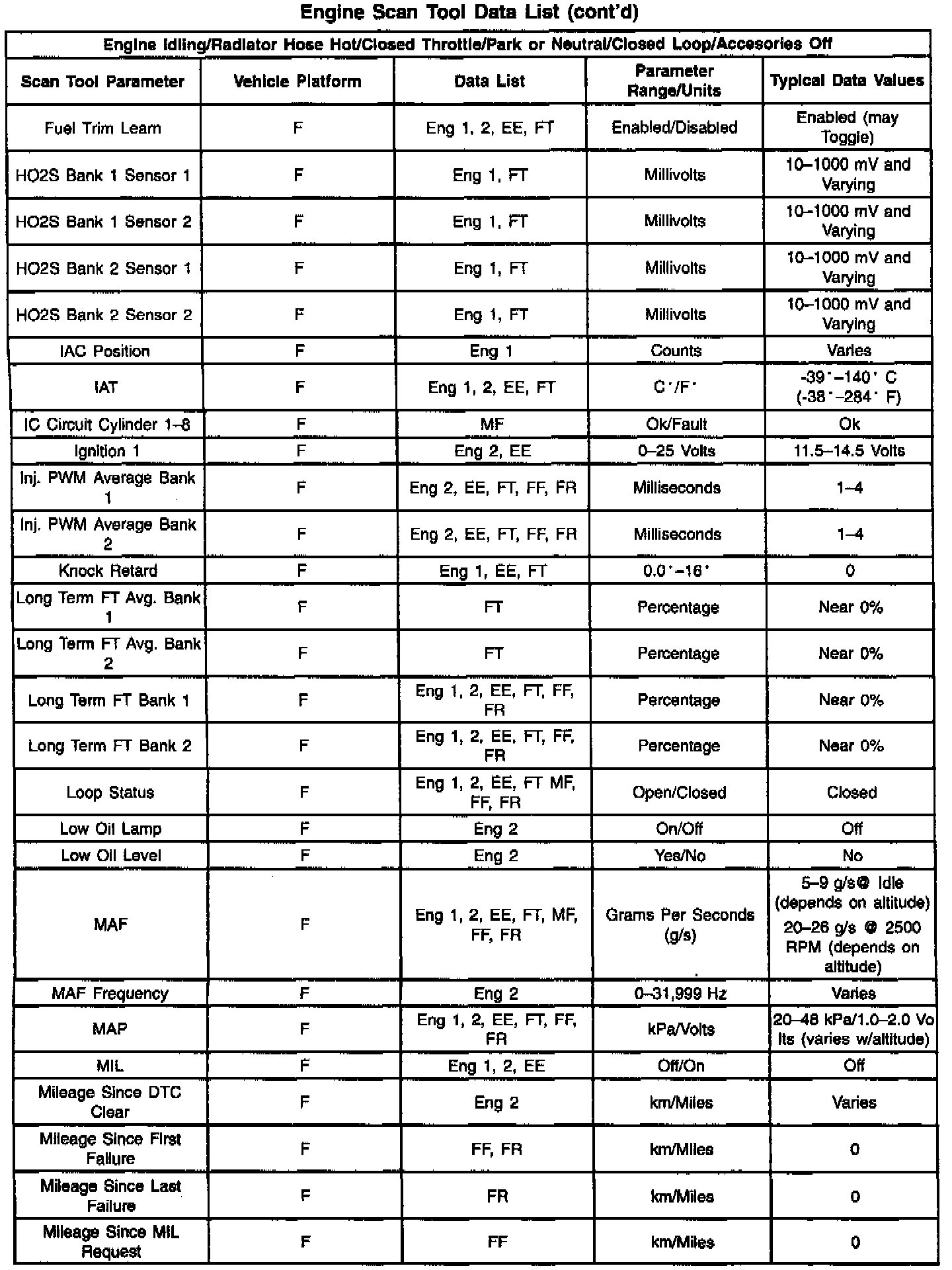 The Engine Scan Tool Data List contains all engine related parameters that are available on the scan tool. The list is arranged in alphabetical order. A given parameter may appear in any one of the data lists, and in some cases may appear more than once, or in more than one data list in order to group certain related parameters together.