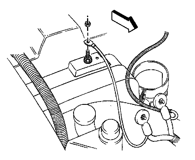 2. Install the ground lead and negative cable to the engine block bolt (1).