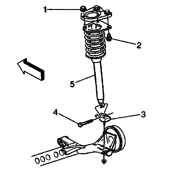6. Install both springs (2) and insulators (1) while carefully raising the axle assembly and positioning the axle assembly in order to install the lower shock absorber mount stud and nut (5).