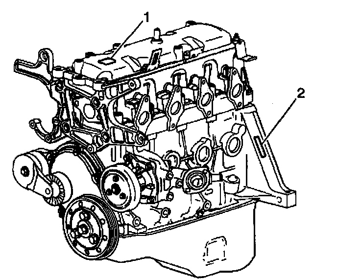 Identification can be made through the use of the Broadcast Code label on the valve rocker arm cover (1) and the use of the partial VIN etched on the left side of the engine block above the starter (2).