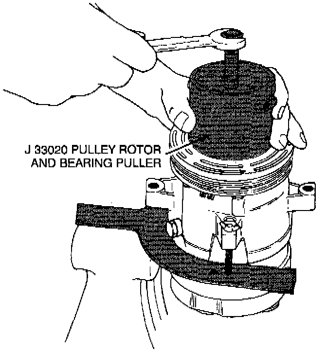 4. Hold the J 33020 puller in place and tighten the puller screw against the puller guide to remove the pulley rotor and bearing assembly.