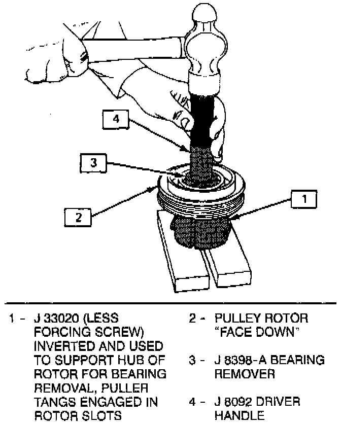 5. To prevent damage to the pulley rotor during bearing removal the rotor hub must be properly supported.