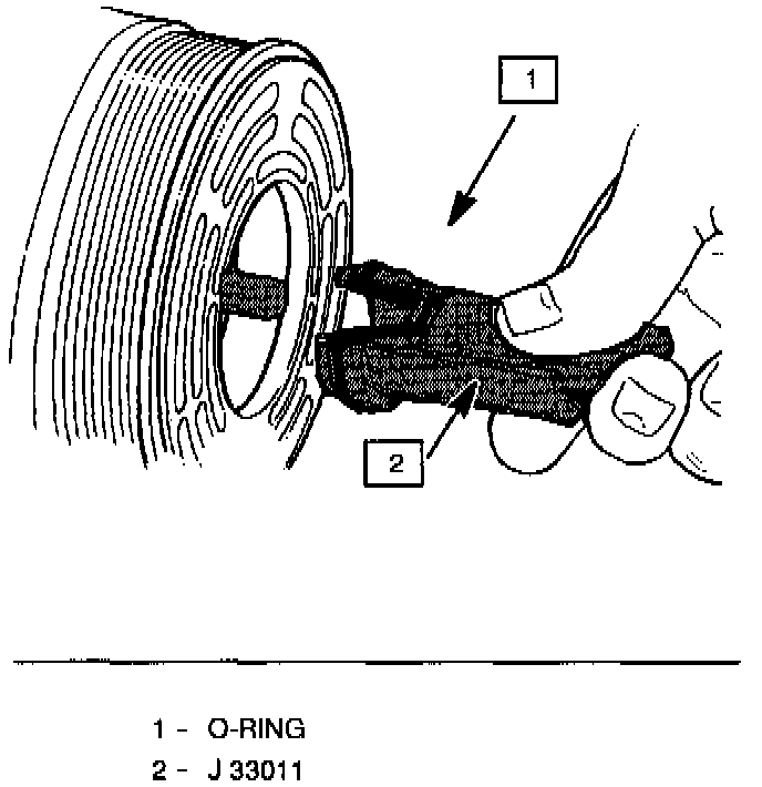 1. Dip the new seal O-ring in clean 525 viscosity refrigerant oil and assemble onto O-ring installer J 33011. "New".