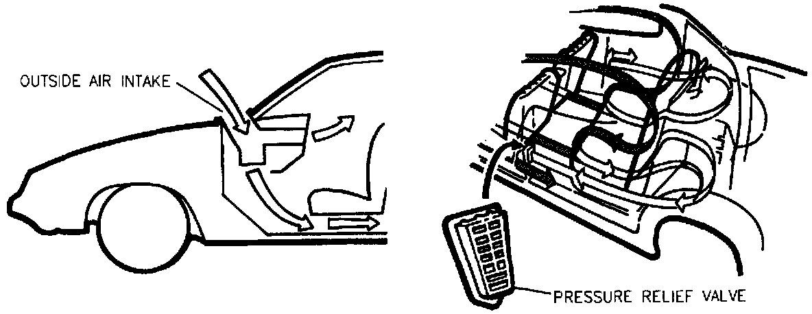 This vehicle has a flow-through ventilation system. A supply of outside air flows into the vehicle when the blower motor is running. With the side windows closed, some air will flow into the cowl air inlet grille, through the vehicle and out the pressure relief valves.