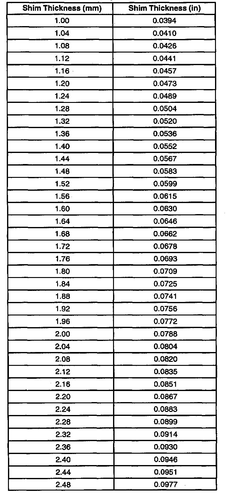 Shim Thickness Chart: