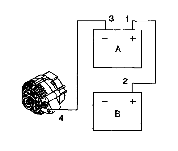11. The final connection (4) is made to a solid engine Ground (such as the generator mounting bracket), at least 450 mm (18 in) from the discharged battery (8).