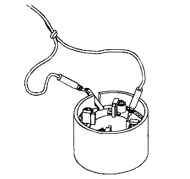 7. Inspect the frame and field assembly by using a test lamp. Place one lead on the field lead terminal and the other lead on one insulated brush. If the lamp fails to light, the series coil is open and will require repair or replacement. This test should be made from each insulated brush in order to test the brush and lead continuity.