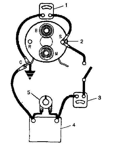 9.2. In order to test the hold-in winding, connect an ammeter (3) in series with 12-volt battery and the switch terminal on the solenoid. Connect a voltmeter (1) to the switch (2) terminal and to the ground. Connect the carbon pile (5) across the battery (4). Adjust the voltage to 10 volts and note the ammeter reading.