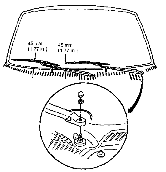 1. Install the wiper arm onto the wiper transmission drive shaft while maintaining a distance of 45 mm (1.77 in) between the wiper blade and the bottom of the windshield.