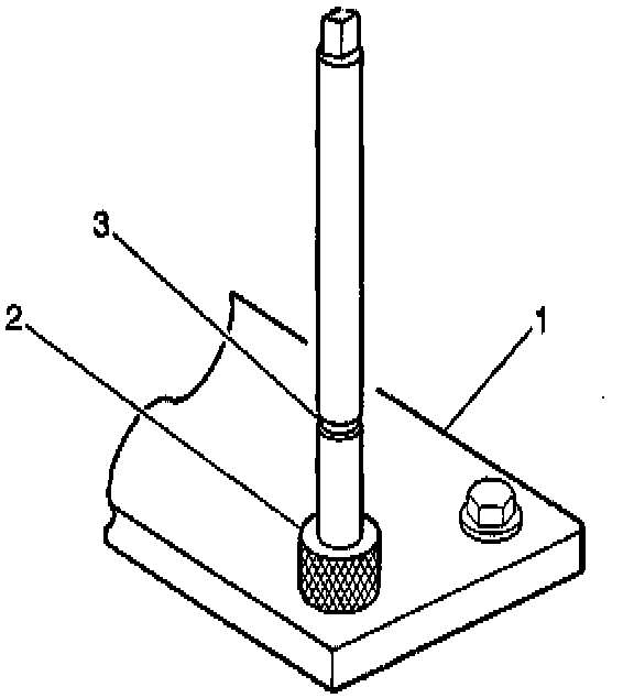 2. Install the fixture plate, bolt, and bushing, onto the engine block. Position the fixture plate and bushing over the hole that is to be repaired.