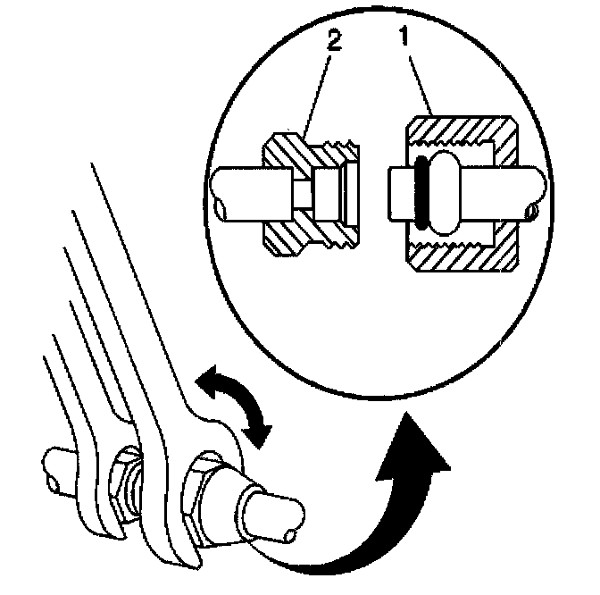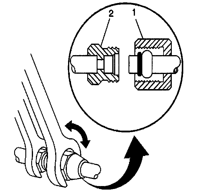 13. Using a back-up wrench on the condenser fitting (2), secure the compressor hose fitting (1) to the condenser.