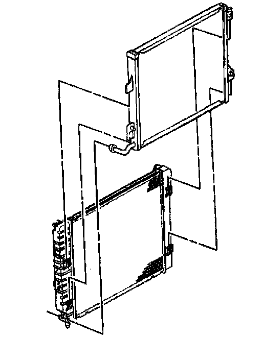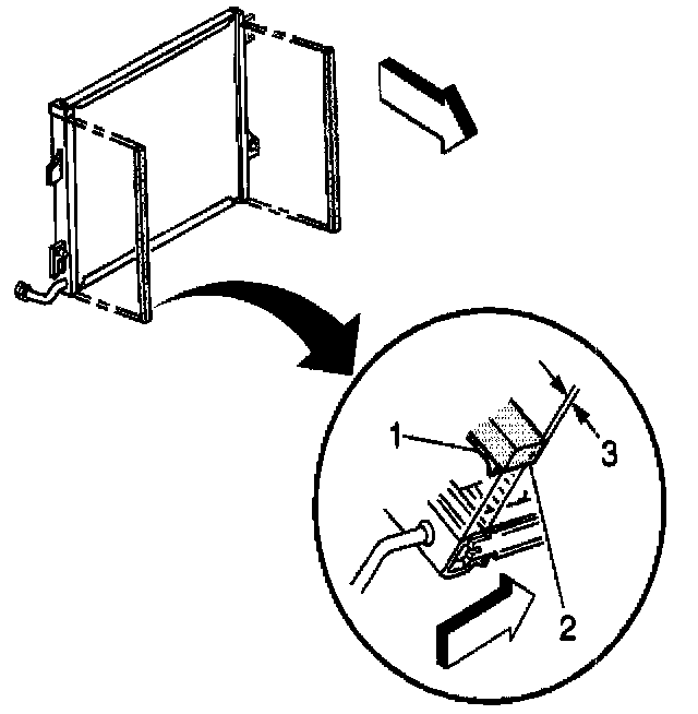 11. Carefully raise the condenser along the radiator Just enough to release the condenser tabs (1) from the radiator slots (2) and the condenser tube from the tube retainer (3).