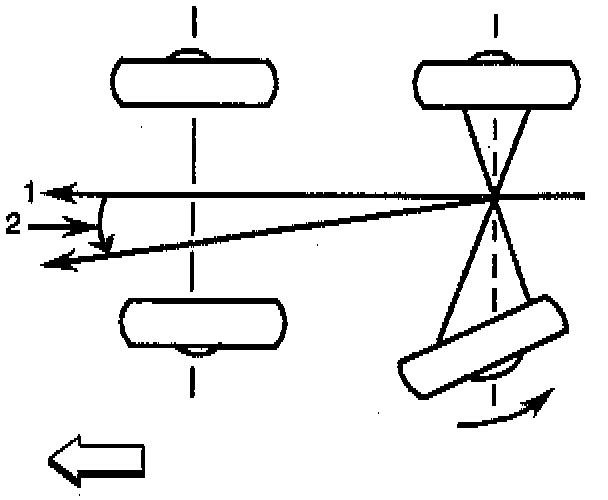 The front wheels aim or steer the vehicle. The rear wheels control tracking. The tracking action is relative to the thrust angle (2). Thrust angle (2) is defined as the path that the rear wheels will take. The thrust angle (2) should be aligned with the body centerline (1).