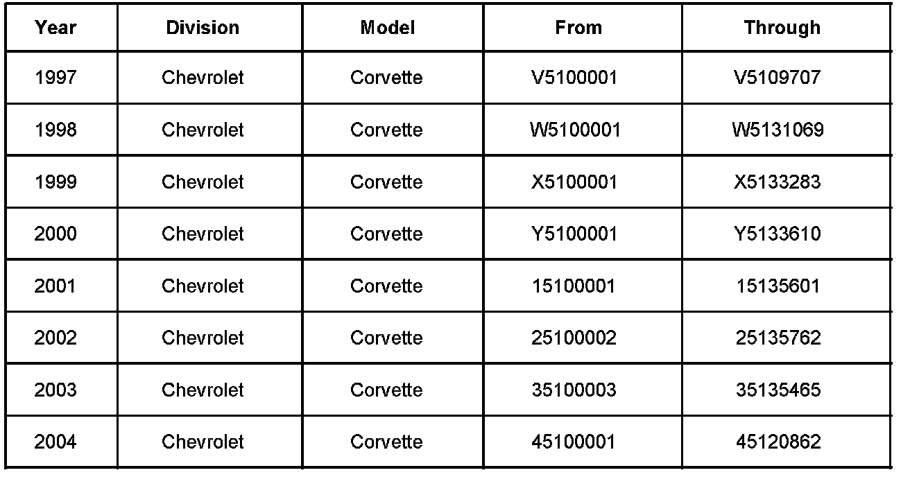 Involved are certain 1997-2004 model year Chevrolet Corvettes equipped with a manual transmission, 1997-2000 Chevrolet Corvette equipped with an automatic transmission, and 2001-2004 Chevrolet Corvette equipped with automatic transmission (European export only), built within the VIN breakpoints shown.