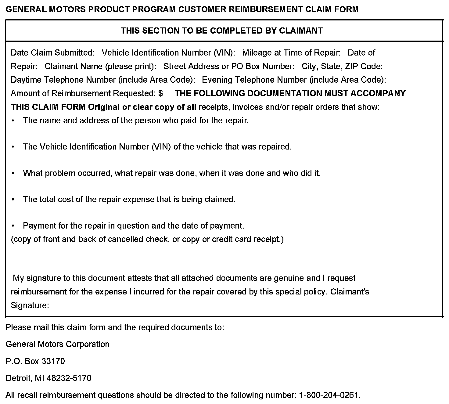 A General Motors Product Recall Customer Reimbursement Procedure Form is shown.