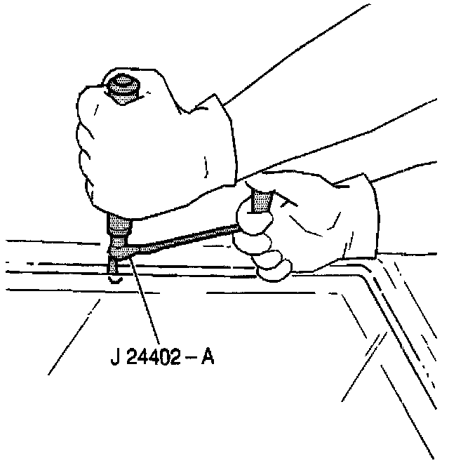 4. Using a J 24402-A cold knife, or equivalent, cut the primary inner urethane bead from the inside of the rear lift window.