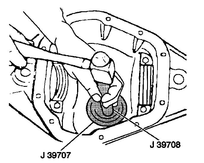 2. Drive the inner bearing cup into the axle assembly using the J39708 and J39707. Make sure the cup is seated on the shims.