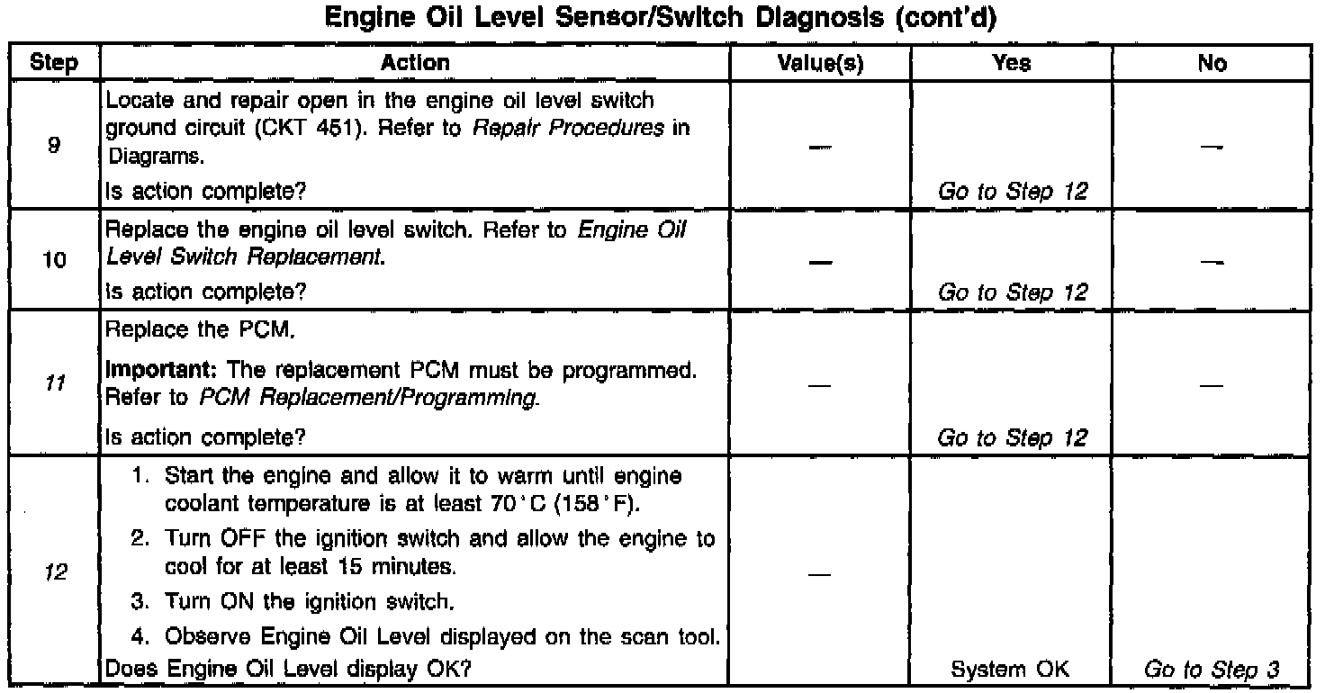 12. For the PCM to check engine oil level, start-up engine coolant temperature must be at least 12°C (22°F) cooler than the engine coolant temperature was last time the ignition was turned OFF. Allowing the engine to warm and then cool ensures that the PCM checks the engine oil level switch and that the information displayed on the scan tool is current.
