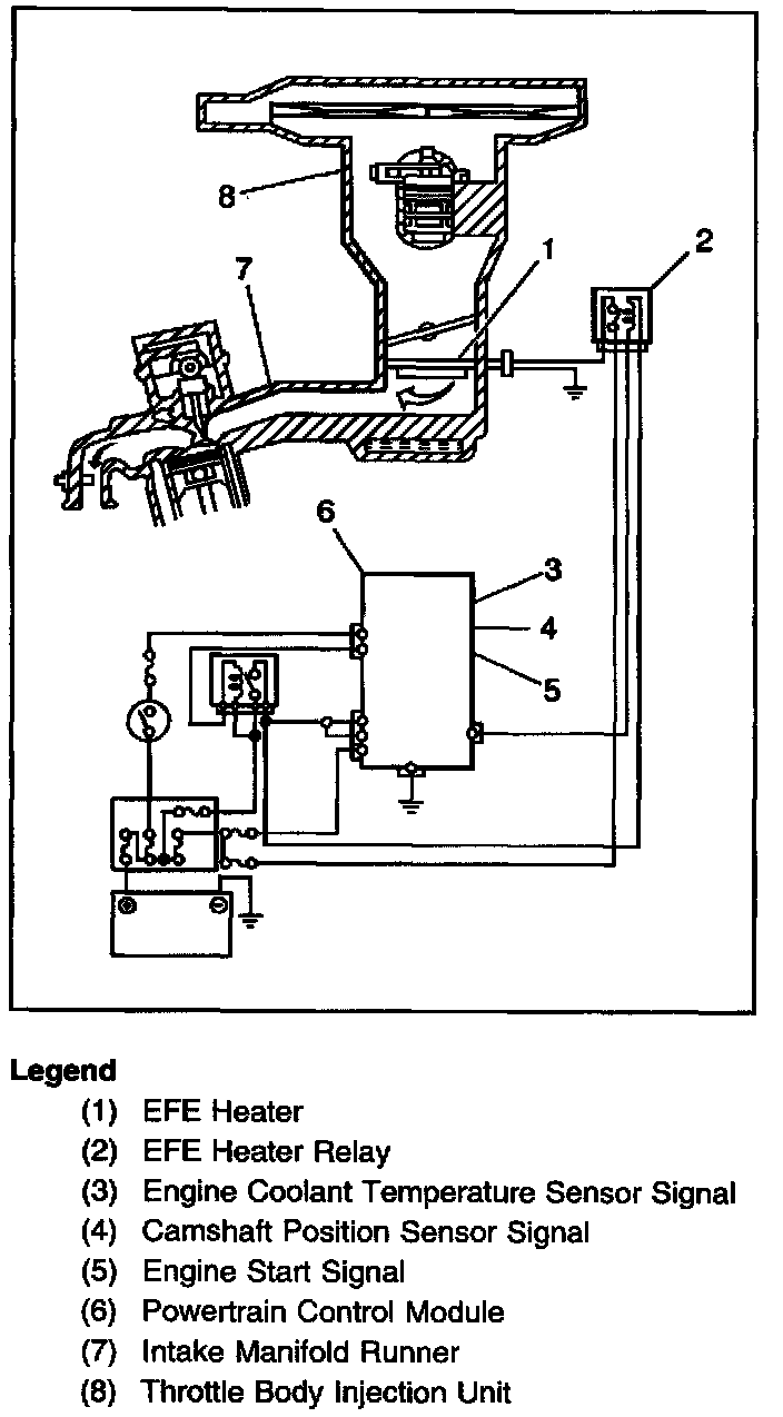 The early fuel evaporation (EFE) system provides rapid heating of the air/fuel mixture during cold start conditions. Rapid heating of the air/fuel mixture provides quick fuel evaporation and more uniform fuel distribution. Rapid heating of the air/fuel mixture improves cold driveability. The EFE system also reduces the length of time the engine is in open loop. Reducing the open loop operation time helps lower exhaust emission levels. The EFE system consists of the following components: