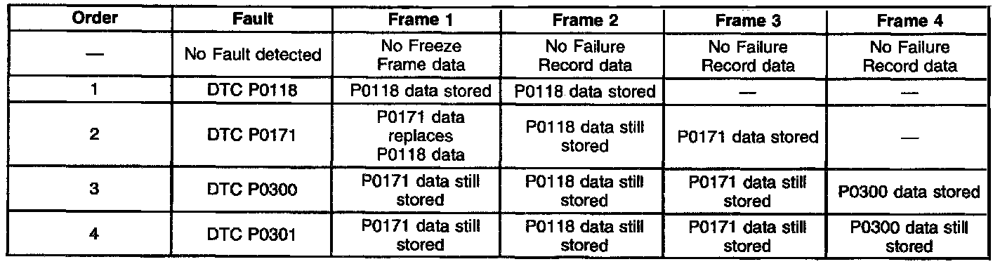 The PCM can store one Freeze Frame and save the recorded data of three additional Freeze Frames as Failure Records. Therefore the PCM can store up to 4 frames of Freeze Frame and Failure Record data. The 1st frame stores data of the fault that was detected first. The data from the 1st detected fault is also stored in the 2nd frame as a Failure Record. The Failure Record data stored in the 2nd frame is permanent, and will not change when a new fault is detected. The 1st frame of Freeze Frame data will remain unchanged unless a fault of a higher priority occurs. A misfire fault (DTC P030-P0304) or a fuel trim fault (DTC P0171 and P0172) will replace the data in the 1st frame of Freeze Frame data because these DTCs have a higher priority under OBD 2 rules. The 2nd through 4th frames of Failure Records will store fault data in the order that the faults were detected regardless of the fault's priority. Utilizing the 4 frames of Freeze Frame and Failure Record data can provide information on the order in which the faults were first detected. The following table indicates how Freeze Frame and Failure Record data is stored when two or more faults are detected.
