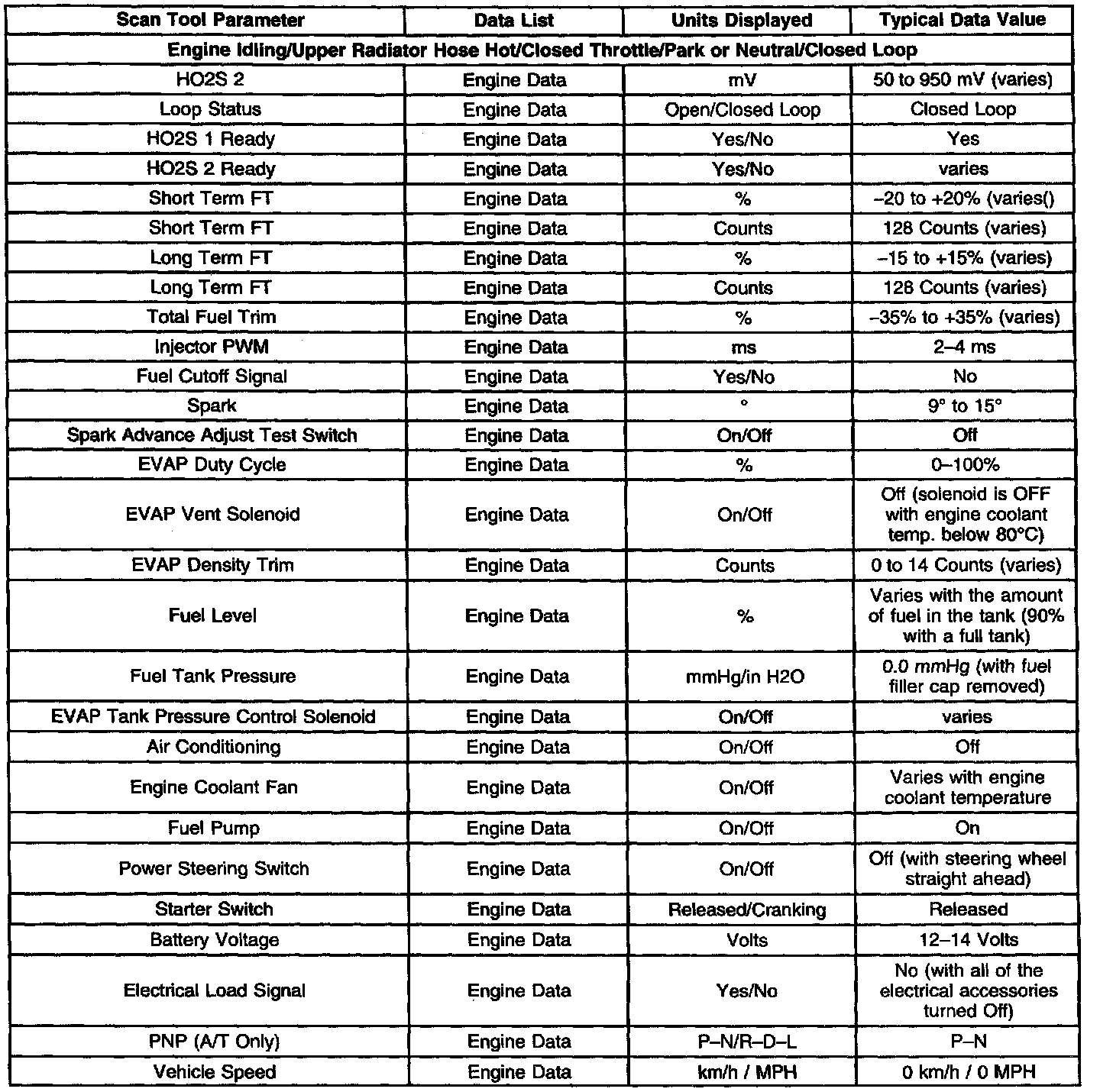 Engine Scan Tool Data ListThe Engine Scan Tool Data List contains all engine related parameters that are available on the scan tool. The list is arranged in the order shown on the scan tool.