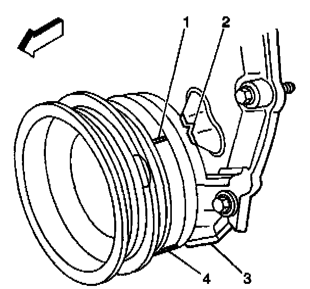 IMPORTANT: The engine front cover has 2 alignment tabs and the crankshaft balancer has 2 alignment marks (spaced 90 degrees apart) which are used for positioning number 1 piston at top dead center (TDC). With the piston on the compression stroke and at top dead center, the crankshaft balancer alignment mark (1) must align with the engine front cover tab (2) and the crankshaft balancer alignment mark (4) must align with the engine front cover tab (3).1. Rotate the crankshaft balancer clockwise until the alignment marks on the crankshaft balancer are aligned with the tabs on the engine front cover and the number 1 piston is at top dead center of the compression stroke.