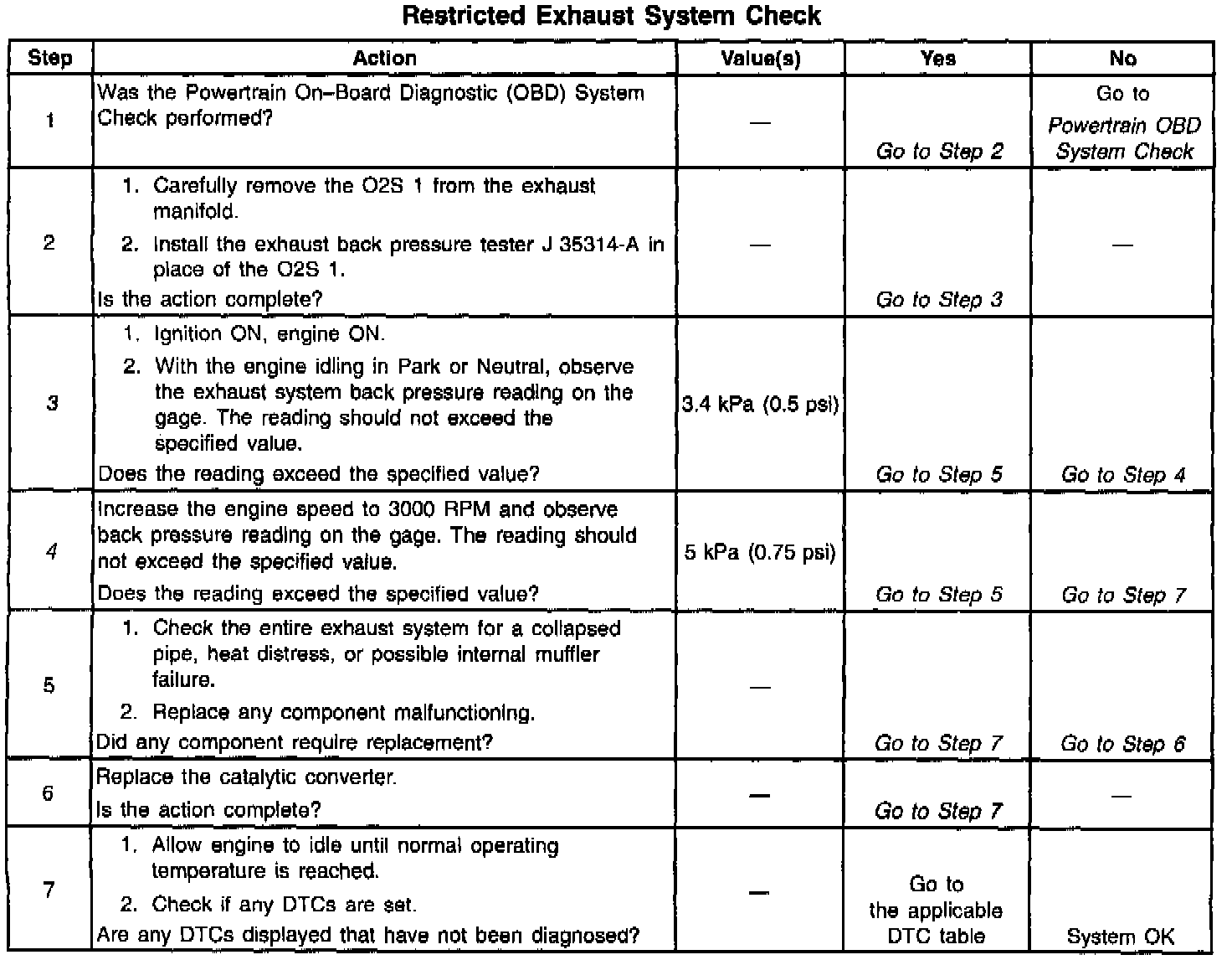Proper diagnosis for a restricted exhaust system is essential before any components are replaced. Using the Restricted Exhaust System Check table should determine if the exhaust system is restricted. The best place for checking the exhaust system is at the O2S 1 location. Once the test is completed, coat threads with anti-seize compound P/N 5613695 or equivalent prior to O2S re-installation.