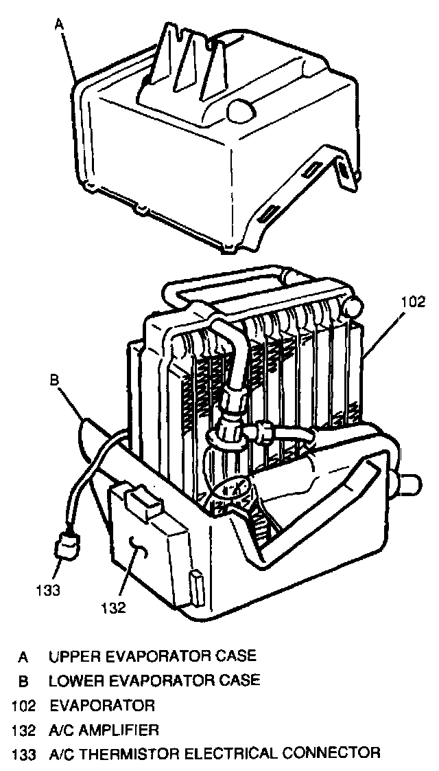 2. A/C amplifier from evaporator case by releasing two lower lock tabs and sliding amplifier upward to disengage from case.
