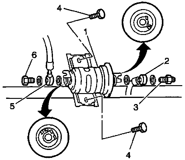 6. Remove the end bolt (6) and the fuel feed outlet hose (5) from the fuel filter.