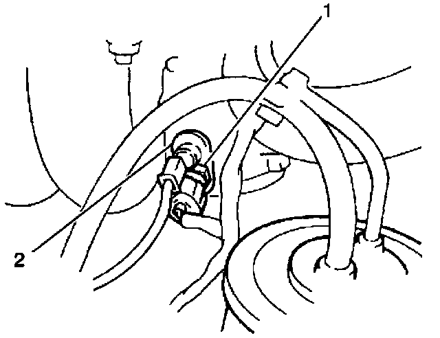 The ECT sensor (1) is located in the engine block below the engine coolant temperature sending unit (2). The ECT sensor is a thermistor (a variable resistor that changes value when the temperature changes). The ECT sensor is connected in series with a fixed resistor in the powertrain control module (PCM). The PCM applies 5 volts to the ECT sensor. The PCM monitors the voltage drop across the ECT sensor and converts the voltage reading into a temperature value. The ECT sensor voltage reading at the PCM will vary with the changes in the engine temperature.