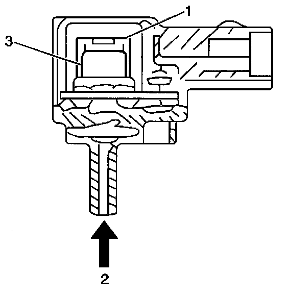 The MAP sensor (1) measures the change in the intake manifold pressure (vacuum) (2). The powertrain control module (PCM) applies 5 volts to the MAP sensor. The MAP sensor consists of a semi-conductor type pressure sensing element (3). The pressure sensing element converts a change in pressure into an electrical signal. The MAP sensor also contains electronic circuitry that amplifies and corrects the electrical signal. The PCM monitors the change in manifold pressure that results from the changes in RPM and engine load. A low MAP sensor voltage reading at the PCM indicates low manifold pressure. A high MAP sensor voltage reading at the PCM indicates high manifold pressure.