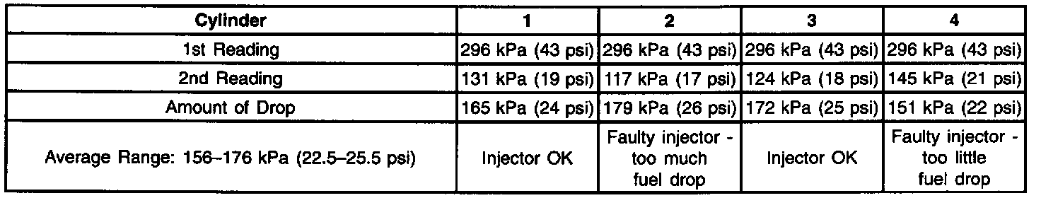 7. The fuel injectors are flowing properly if the pressure drop value for each fuel injector is within 10 kPa (1.5 psi) of the average pressure drop value. Calculate the pressure drop value for each fuel injector by subtracting the second pressure reading from the first pressure reading. Refer to the examples in the preceding table.