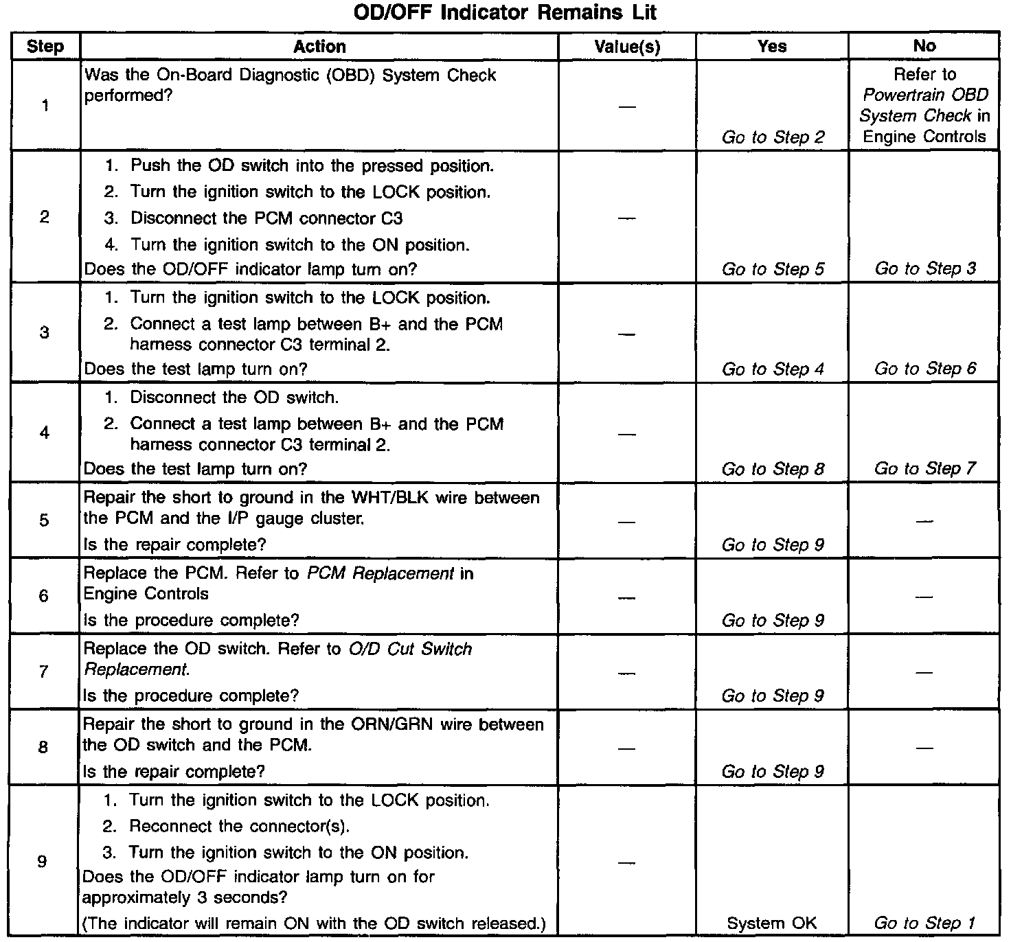 9. This step tests for proper operation of the OD/OFF indicator.