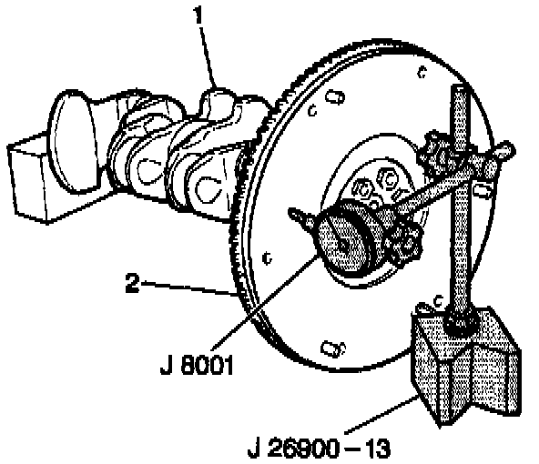 ^ Use a J 8001 with a J 26900-13 in order to measure the flywheel (2) for face runout. Replace the flywheel if the runout exceeds 0.2 mm (0.0078 in).