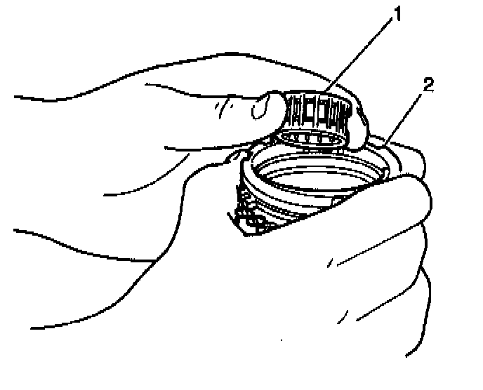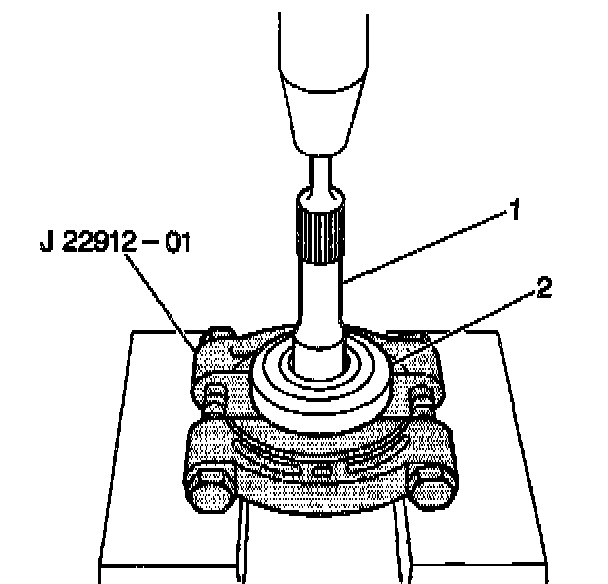 3. Use the J 22912-01 and a press arbor in order to remove the front input shaft bearing (2) From the input shaft (1).