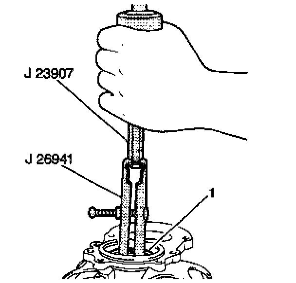 4. Use the J 26941 and the J 23907 in order to remove the front input shaft oil seal (1) from the input shaft bearing retainer.
