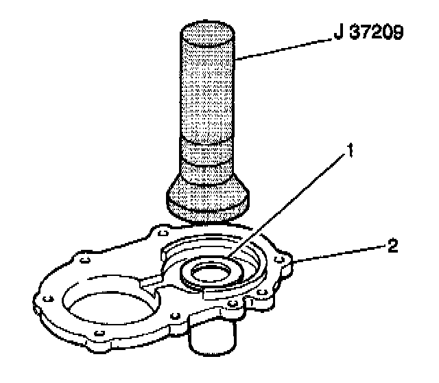 2. Use a hammer and the J 37209 in order to install the new front input shaft oil seal (1) into the input shaft bearing retainer (2).