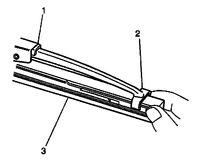 Pull the front wiper blade rubber (3) out of the wiper blade assembly hooks (2).