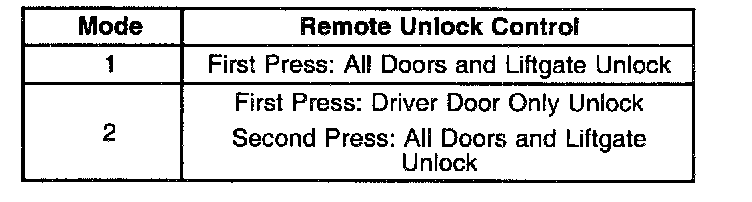 5. Press the transmitter UNLOCK button. The seat belt telltale will flash and the chime will sound 1-2 time in order to indicate which remote unlock control mode the BCM is in. Each time the transmitter UNLOCK button is pressed, the mode number will advance. A transition past mode 2 will repeat and start again at mode 1.