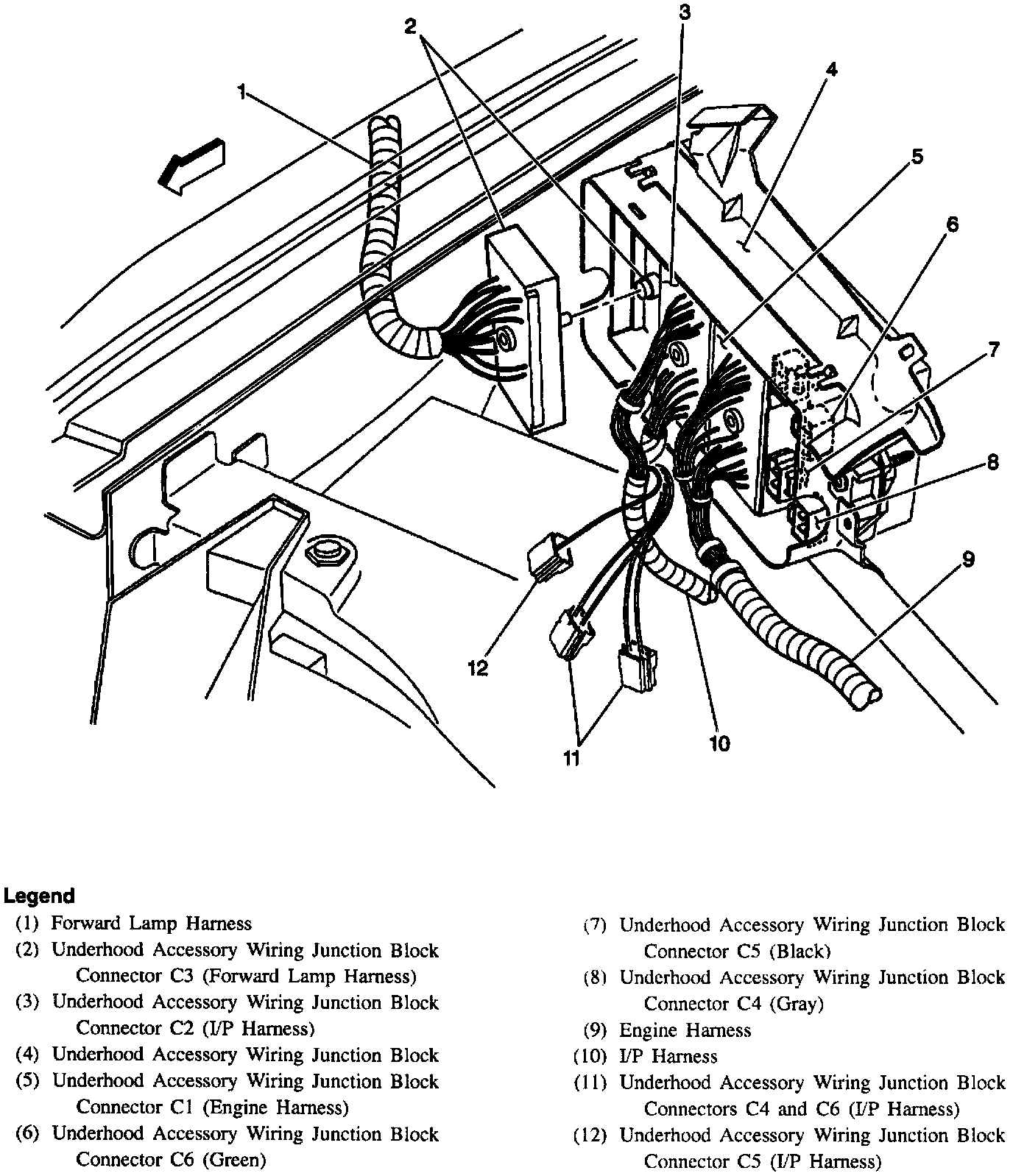 Underhood Accessory Wiring Junction Block, Top RH Side Of Engine Compartment: