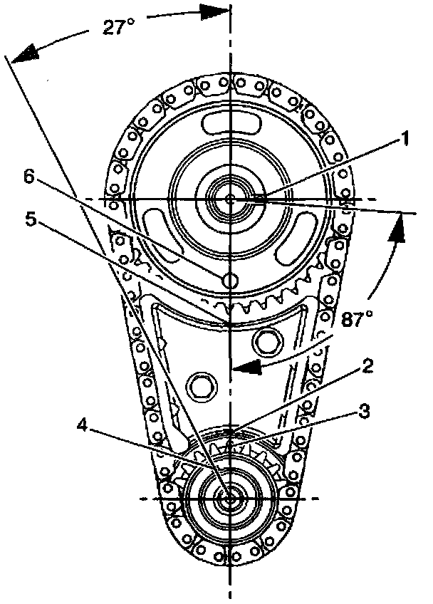 ^ The timing chain dampener (5) to the camshaft sprocket locator hole (6).