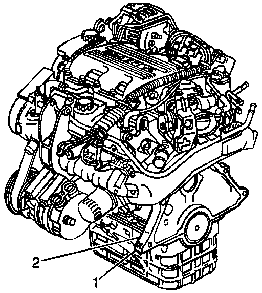 The eighth character in the Vehicle Identification Number (VIN) identifies the engine. Adhesive-backed labels attached to the engine, laser etching or stampings on the engine block indicate the engine unit number/date code. All engines are stamped with a VIN derivative. The primary location (1) of the VIN derivative and the secondary location (2) of the VIN derivative for the 3400 (LA1) engine is above the starter motor on the engine block. For more information on the VIN derivative, refer to Application and ID / VIN Derivative. Application and ID