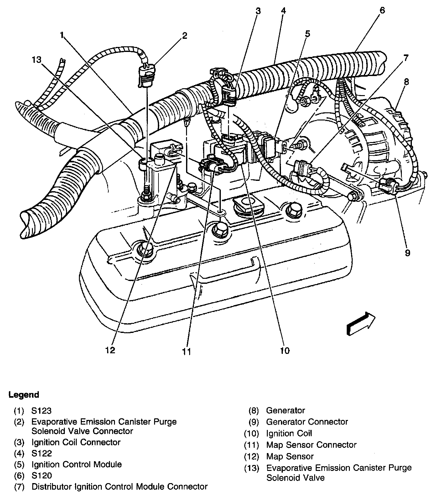 On the top of the engine in front of the coil