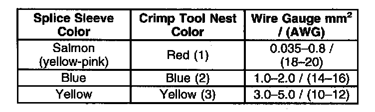 4. Select the proper sealed splice sleeve according to the wire size. Refer to the above table at the beginning of the repair procedure for the color coding of the splice sleeves and the crimp tool nests.