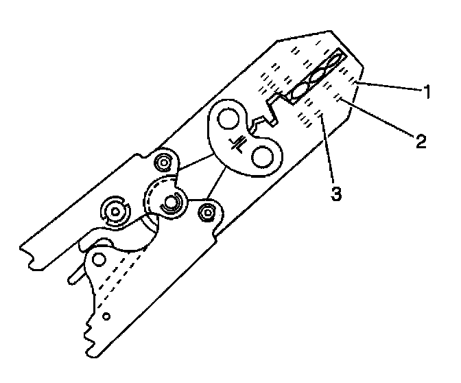 6. Place the splice sleeve in the nest. Ensure that the crimp falls midway between the end of the barrel and the stop. The sleeve has a stop (3) in the middle of the barrel (2) in order to prevent the wire (1) from going further. Close the hand crimper handles slightly in order to firmly hold the splice sleeve in the proper nest.