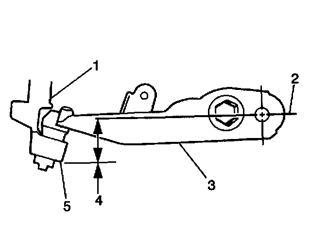 4. Measure from the lower control arm (3) pivot bolt center line (2) down to the lower corner (5) of the steering knuckle (1) in order to obtain the Z height dimension (4).