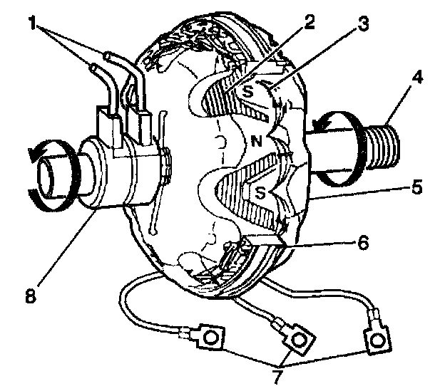 Current flows (1) through the slip rings (8) to the rotor winding (2) in order to create a magnetic field (3). The engine-driven rotor (4) is rotated by the engine within the stator (5). This rotation creates an alternating current (AC) voltage in the stator windings (6). The AC voltage goes to the rectifier bridge (7). The rectifier bridge converts this AC voltage to direct current (DC) voltage. The DC voltage is delivered from the generator's output terminal to the battery and the electrical systems through a fusible link (11). The regulator grounds circuit 225(10) when the charging system voltage is abnormal. This information causes the PCM to send a class 2 message to the instrument panel cluster, which activates the CHECK GAGES lamp.