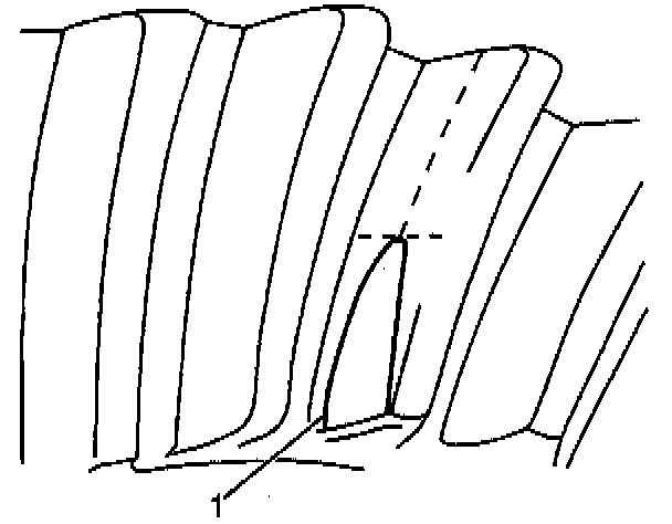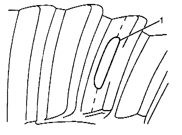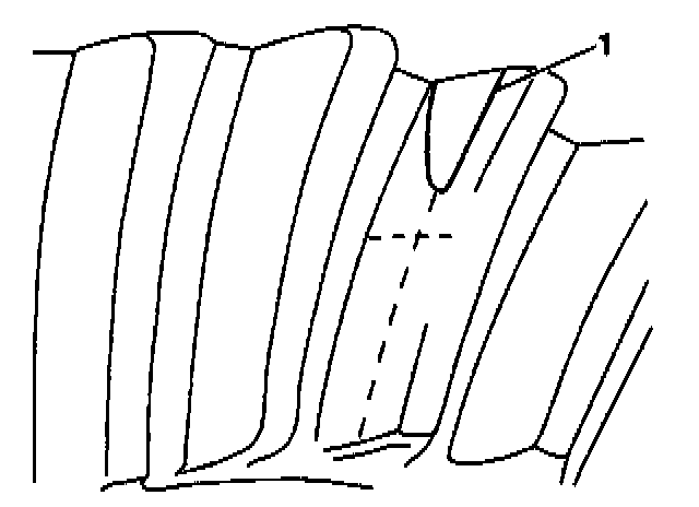 19. If this contact pattern (1) exists, repair the heel contact by decreasing the backlash. This moves the area of differential drive pinion gear contact (1) toward the toe.