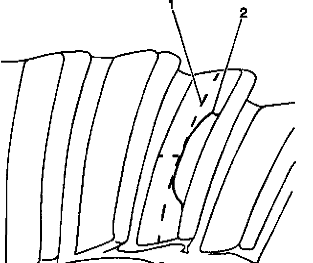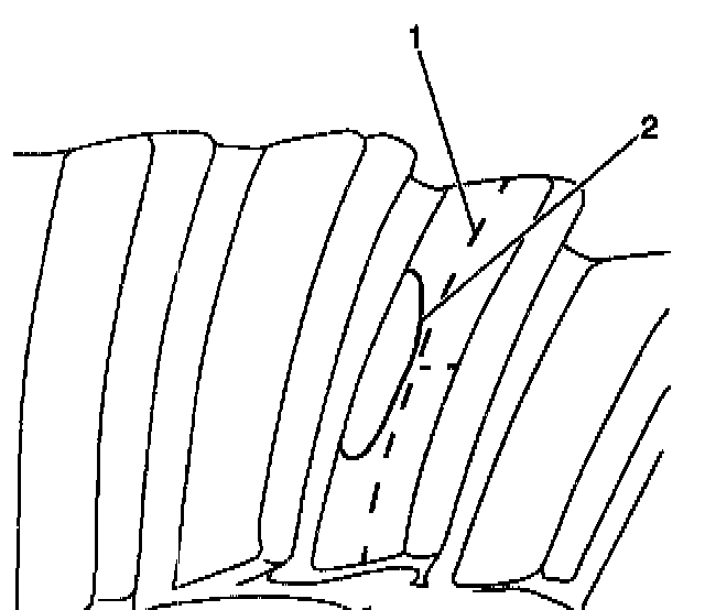 15. If this contact pattern (2) exists, repair the low flank contact by decreasing the shim thickness of the bearing on the differential drive pinion gear. This moves the smaller diameter of the contact (2) out toward the center line (1) of the differential ring gear.