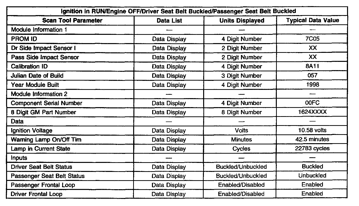 The scan tool data list contains all Restraint related parameters that are available on the scan tool. The list is arranged in the order as they appear on the scan tool.